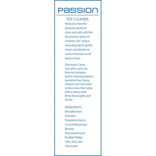 Keep all your toys at peak performance with this Passion Toy Cleaner! Made with quality ingredients, it has a water base that makes it compatible with all toy types and citric acid that cuts through lube and fluids. The Benzalkonium Chloride is a body safe, high quality disinfectant and antiseptic so you can clean with confidence. Contained in a travel friendly size, the 8 ounce bottle can be packed in a duffel bag or suitcase as easily as it can be stashed in a bedside table drawer.