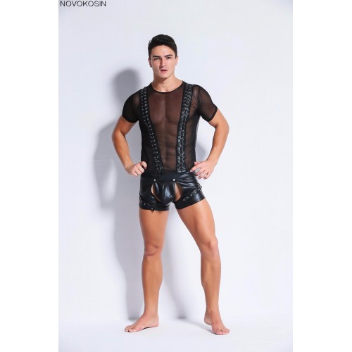 Fashion Black Faux Leather With Front Tulle Lace Up Top only